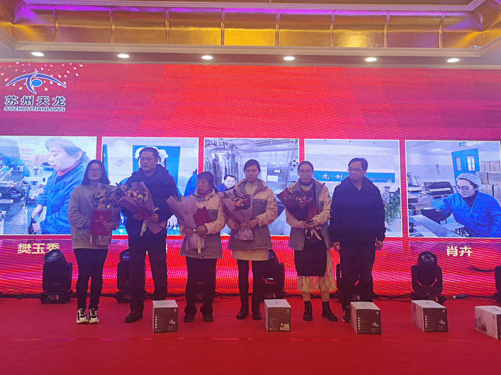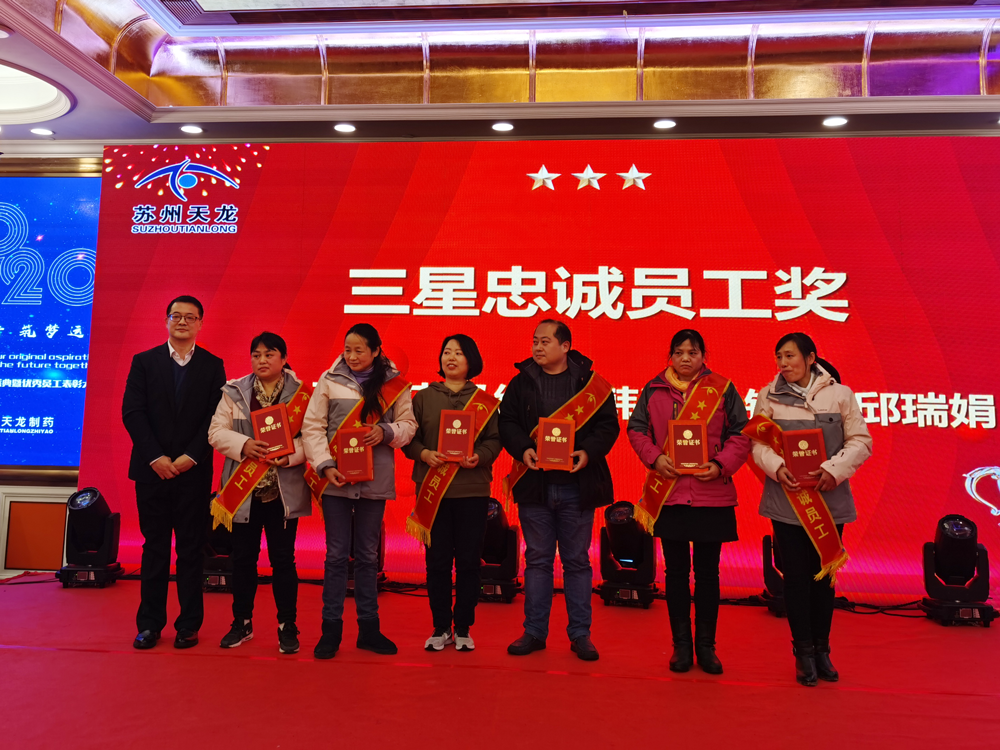 2020年1月19日,,,,苏州天龙制药召开2019年岁情聚会暨表扬大会,,,,本次聚会以“同心偕行 筑梦远航”为主题。。。。。。公司总司理范弋、副总司理汤国平、全体员工共聚一堂,,,,加入了此次聚会。。。。。。